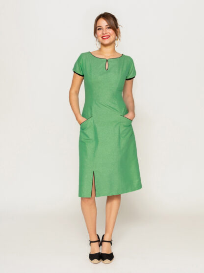 Sådan læser du målskemaet: Målene i skemaet er de cm-mål, som kjolen er syet efter i de forskellige størrelser. Du vil sandsynligvis ikke passe målene 100 %, så gå efter, at barmen passer dig godt (der skal helst være 1-3 cm ekstra vidde i barmen). Du skal generelt ikke være bange for lidt ekstra vidde i stoffet på en 2-5 cm – og på denne kjole mere i hoftevidden. Men der må selvsagt ikke være nogle mål, du slet ikke kan passe.