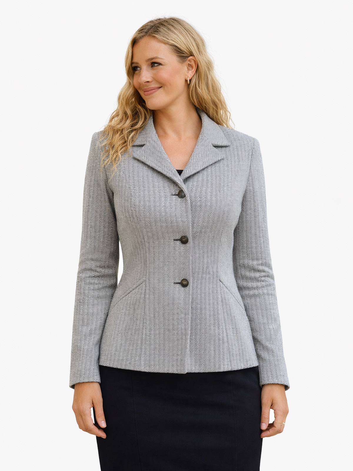 Vores stilfulde Fallulah-blazer er fremstillet i blød, økologisk twill. Stoffet er vævet i sort og hvid sildeben, hvilket på afstand giver et smukt lyst udtryk. Det bløde inderfor i Tencel sikrer en let og behagelig pasform, der føles skånsom mod huden. Blazeren lukkes med metalknapper, som tilfører et cool twist til det elegante design. Den er det oplagte valg for dig, der ønsker at kombinere stil, komfort og bæredygtighed i din garderobe.