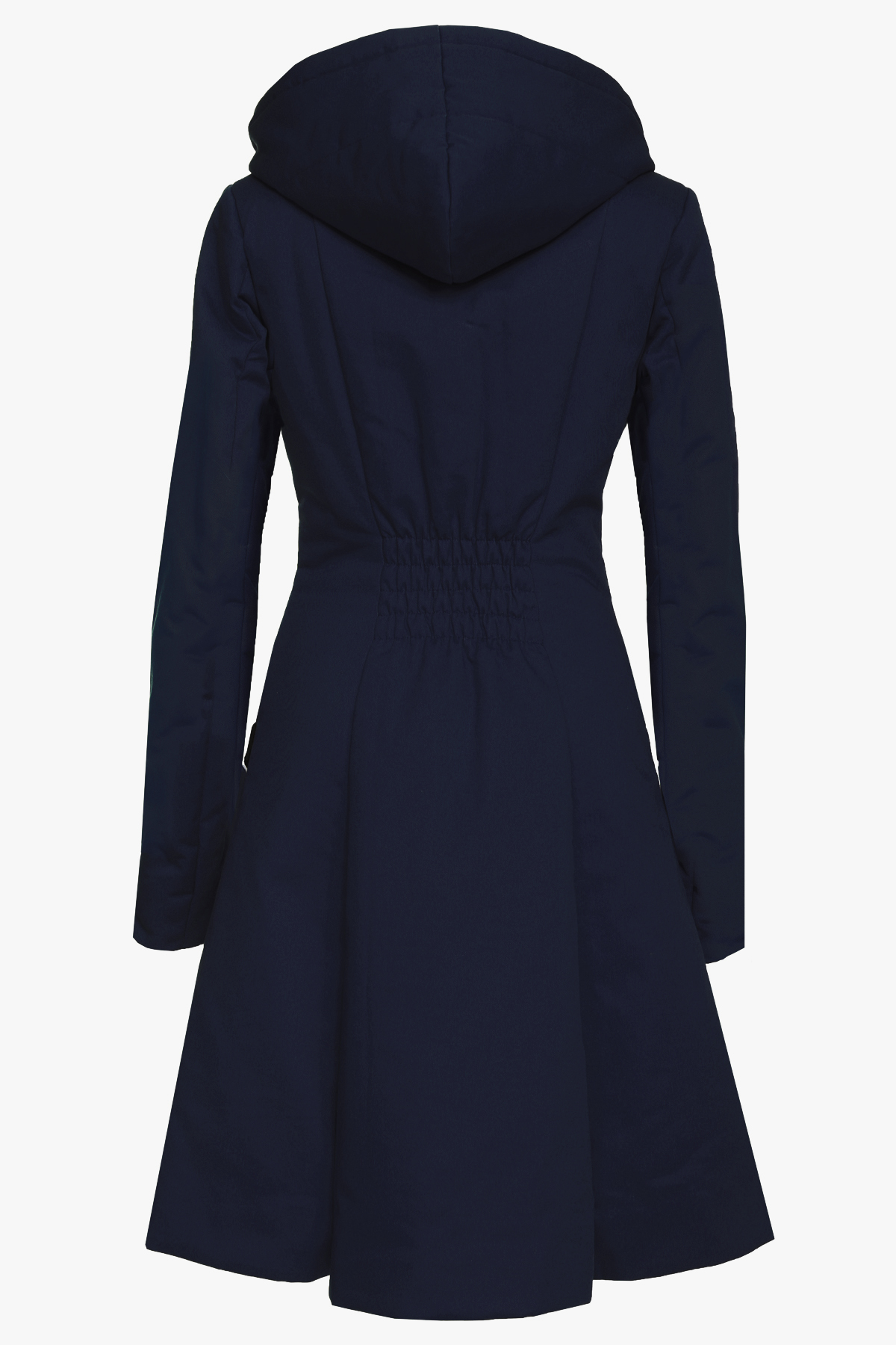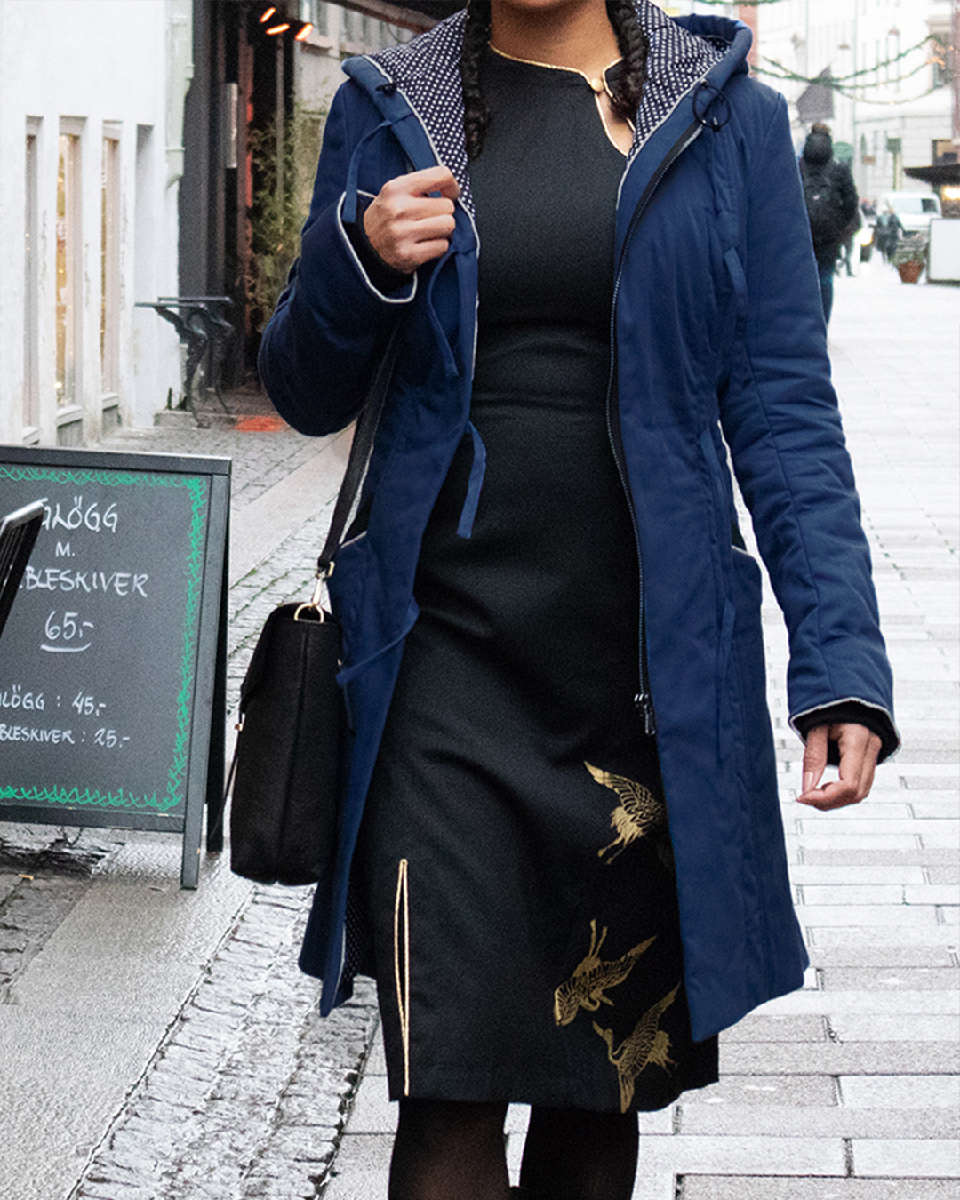 Detaljer: Isolde er en meget varm, elegant og funktionel vinterfrakke, designet til at sidde tæt og smukt på kroppen. Den er syet i en kraftig, økologisk bomuld og foret med en tyk Thinsulate®-isolering, der holder dig varm ned til -15°C. Et elastikpanel i ryggen giver en smuk, feminin silhuet og forhindrer “telt-looket”. Frakken lukkes med lynlås og bindebånd foran, og ærmerne samt de dybe lommer er afsluttet med ribkanter. For ekstra synlighed i vintermørket har frakken et reflekstittebånd, der går igen i både lommerne og hætten.