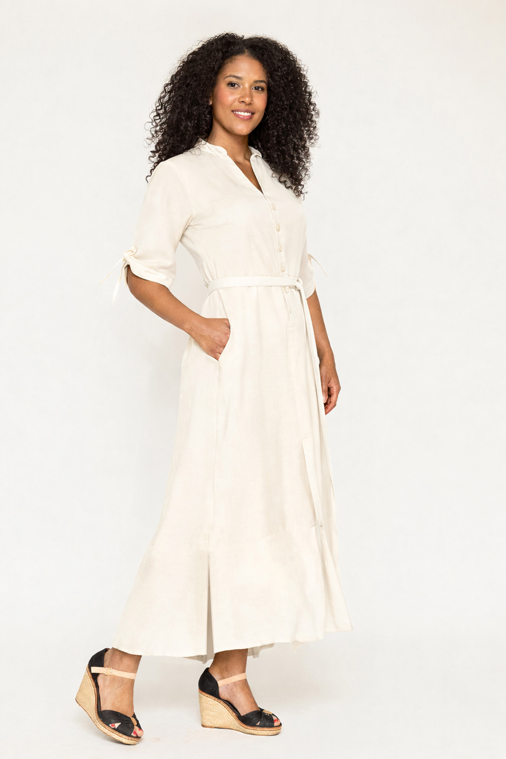 Længden er 140 cm fra nakken og ned. Kjolen er, på trods af det faste stof, ret fleksibel og har en god pasform, idet den har et elastikpanel i ryggen samt knapper fortil og et bindebælte. Kjolen egner sig derfor både godt til kvinder med timeglas-, søjle eller A-facon.
