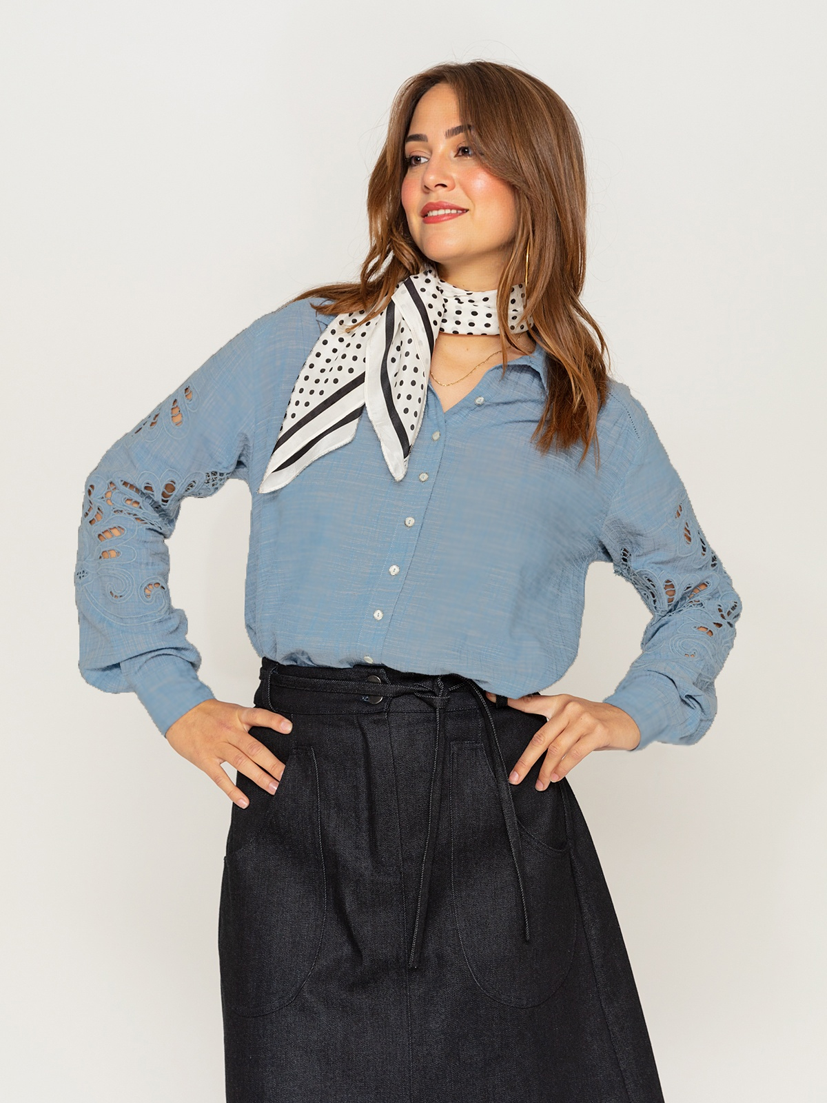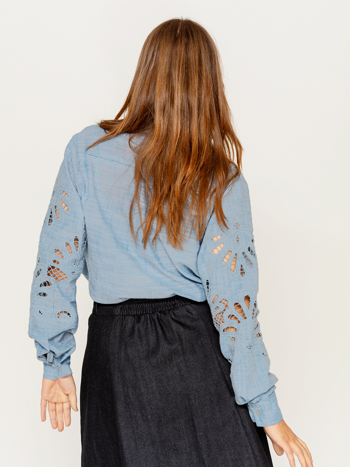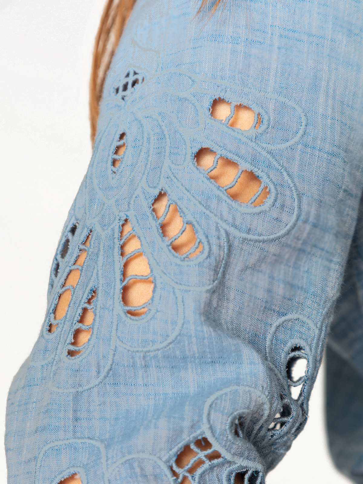 En smuk Ecouturlig skjorte med broderede cutwork ærmer. Den lukkes med knapper midt foran.