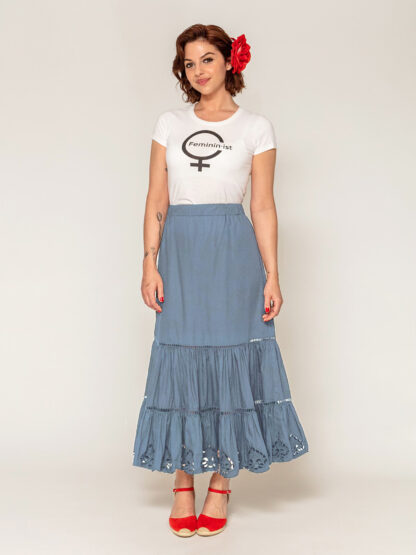 Her får du Ecoutures nye, lange cutwork-nederdel med lommer. Nederdelen er både feminin og utrolig behagelig – den sidder flot og kan styles på mange forskellige måder, alt efter anledning og humør. Det fine cutwork giver et let og elegant udtryk, der passer perfekt til både hverdag og fest.