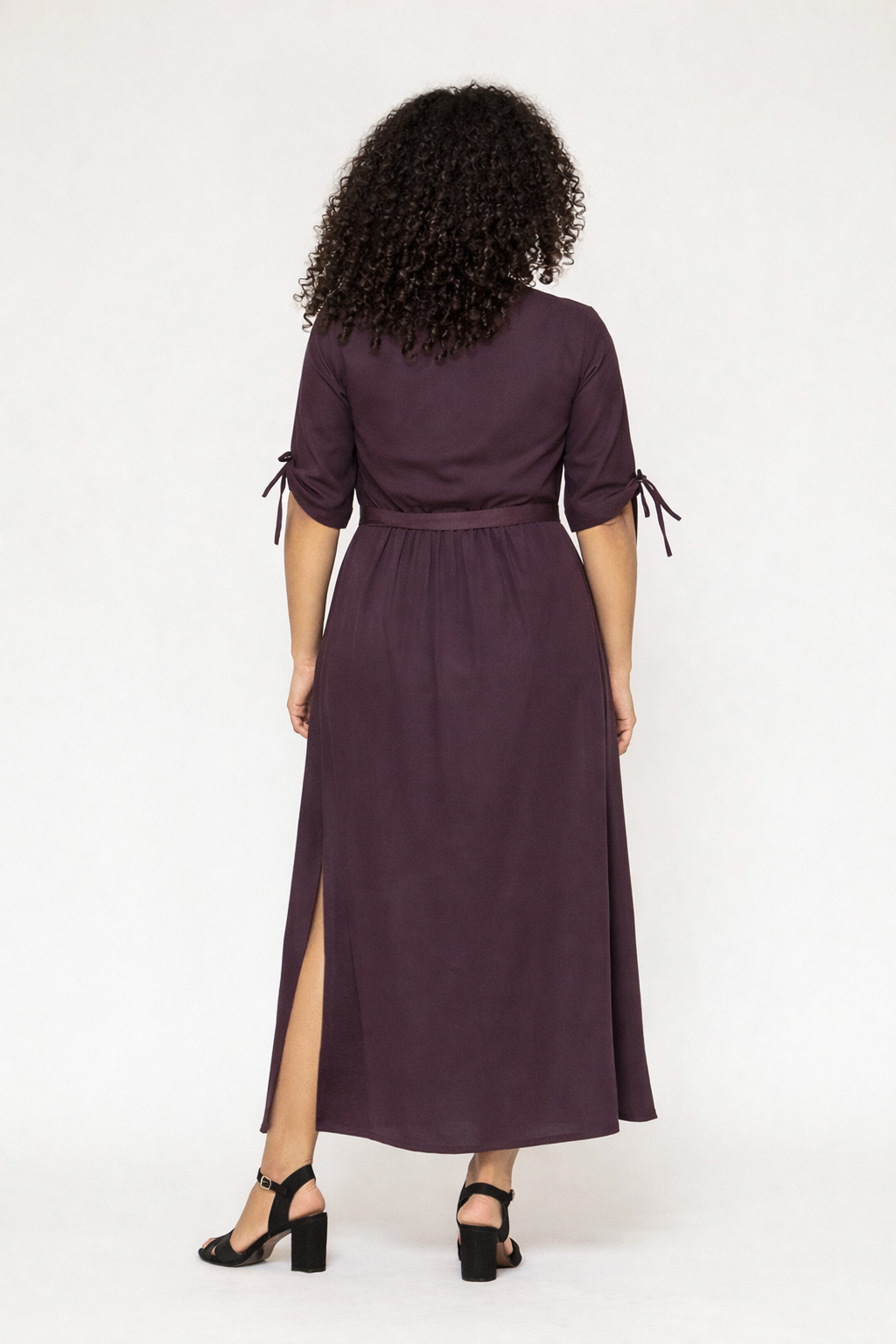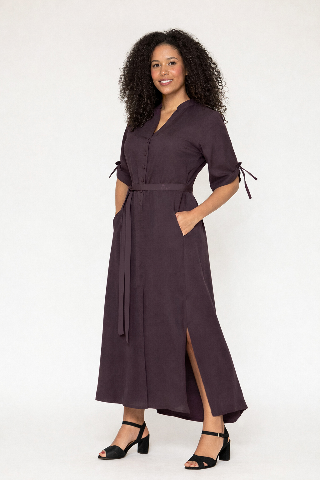 Kjolen har knapper hele vejen ned foran, fastsyet bindebælte i taljen, praktiske lommer og elegante slidser i siderne, som giver bevægelse og lethed. Ærmerne kan bindes op til 3/4-længde og giver et afslappet, feminint udtryk.