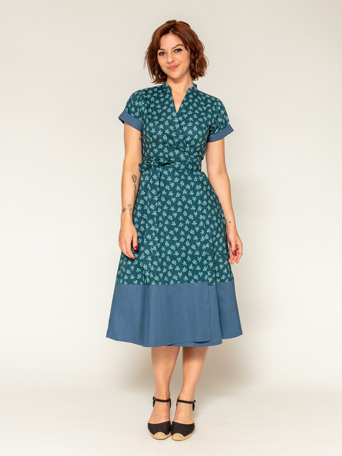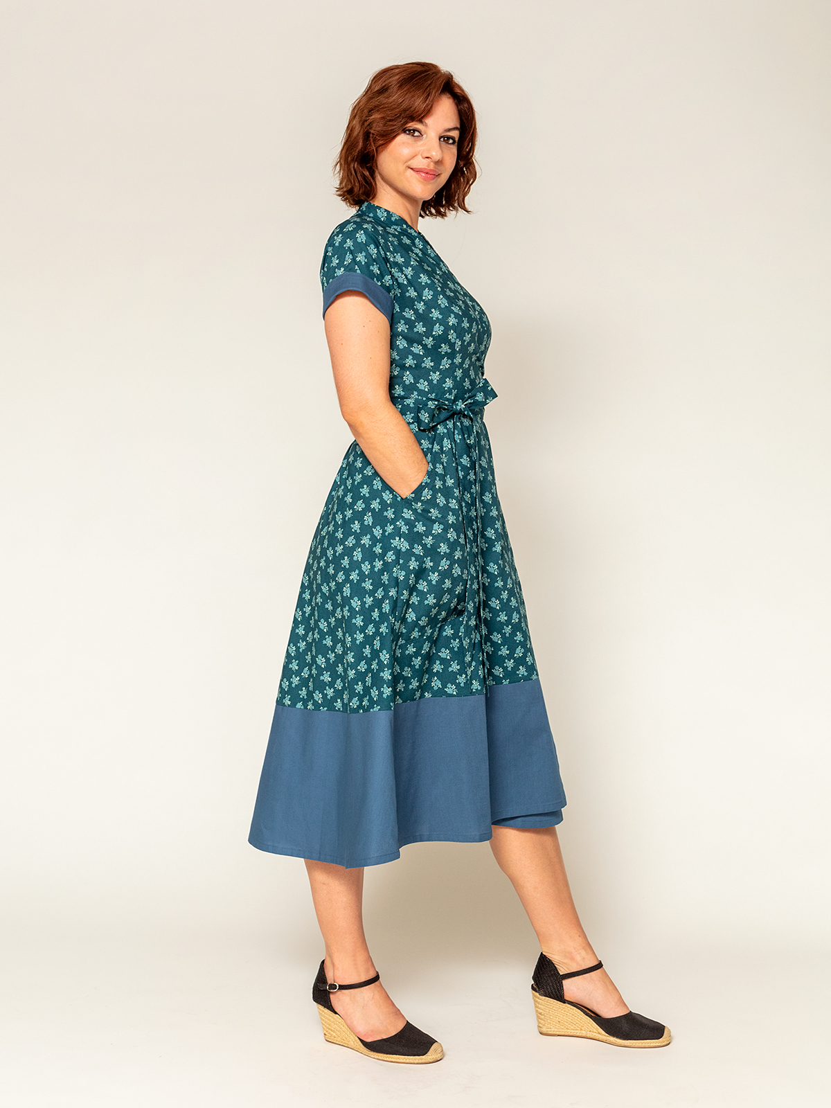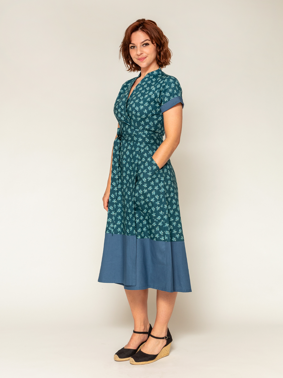 Tora er en chic, tofarvet slå-om-kjole med store, dybe lommer og et langt bindebånd. Bind den i siden, foran eller bagpå – alt efter hvilket udtryk du ønsker.